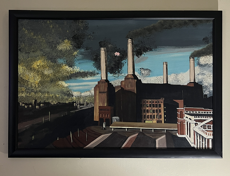 This is another one of the paintings I created to help teach myself how to paint. It is a reproduction of the outside album cover for the ANIMALS album released in 1977 by the psychedelic rock band Pink Floyd. The original art on this album was painted by Storm Thorgerson who also had a big influence on my own painting. To make this piece more of my own, I removed all signs of activity except the single lit window (the original painting is very busy with people pushing carts and trucks coming and going). The next thing I did was add the sickly yellow creeping malaise in the lower left corner. Lastly, I turned the pig around backwards, so we could see his squiggly tale.